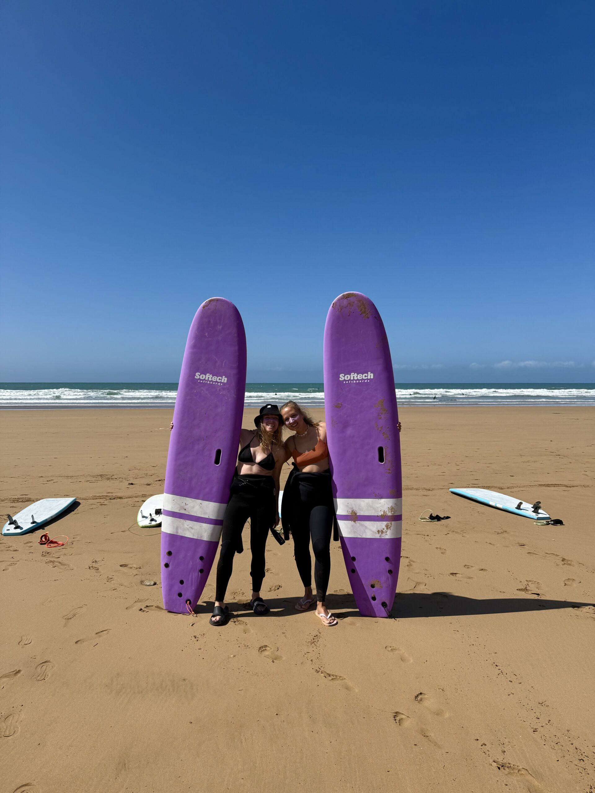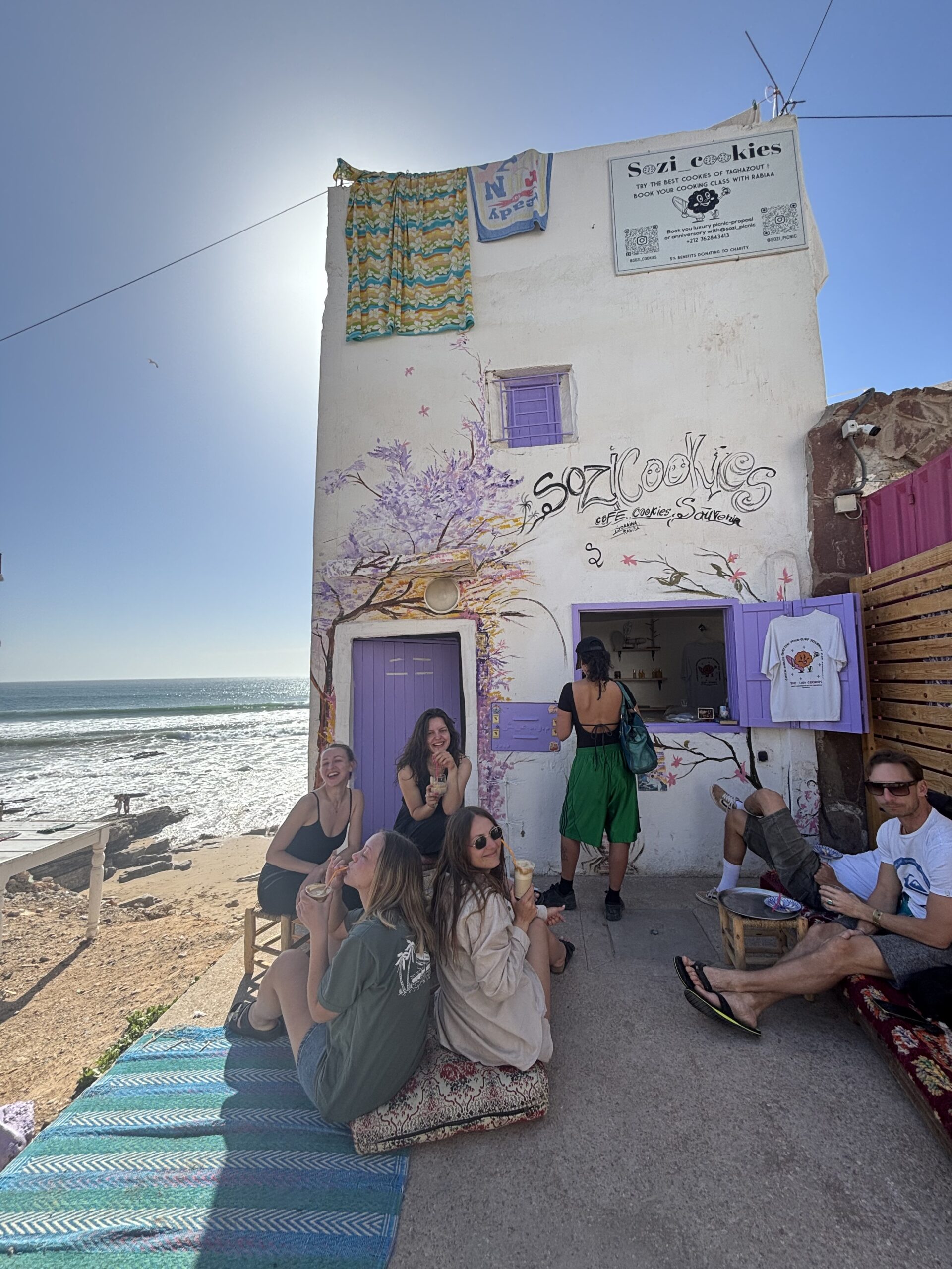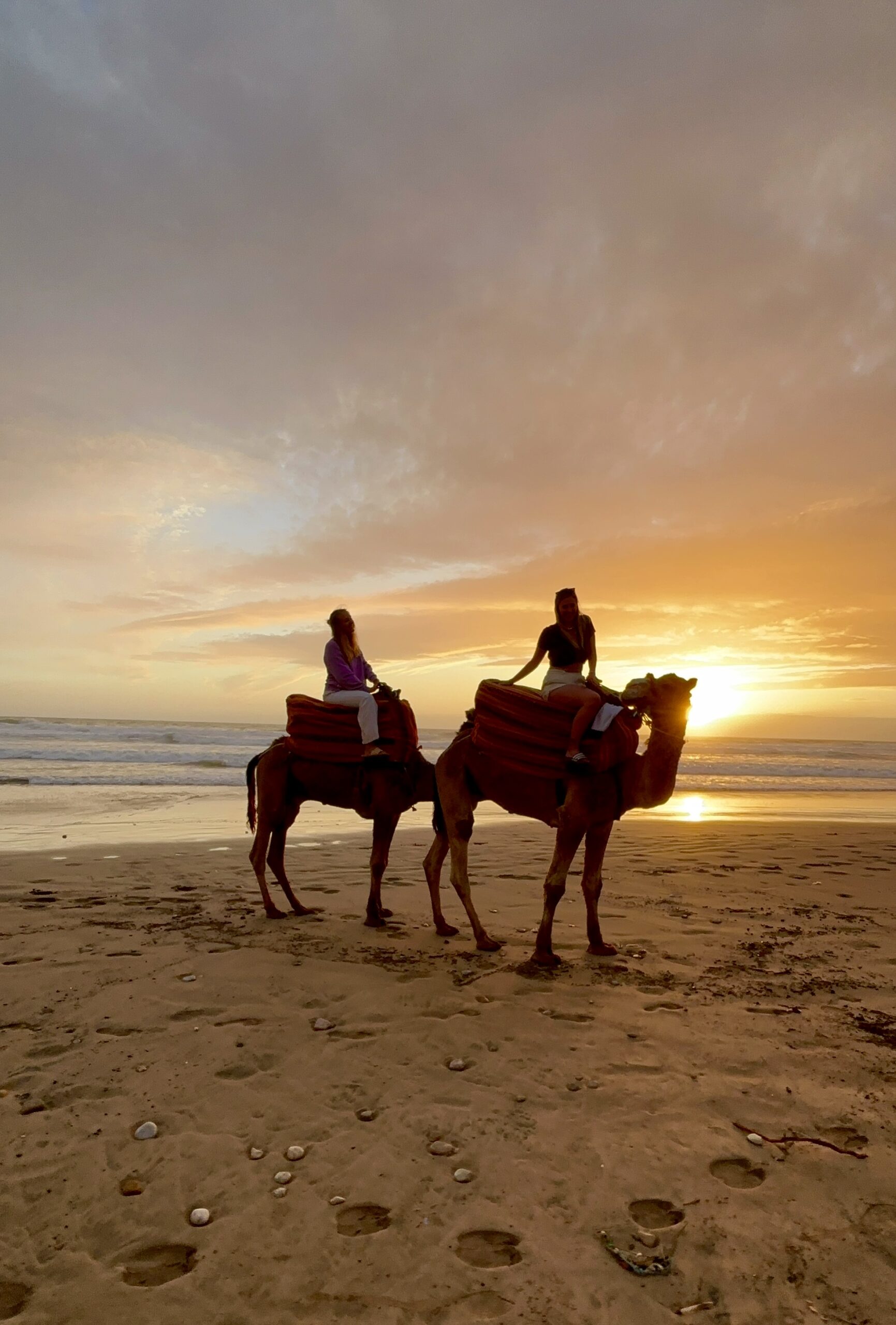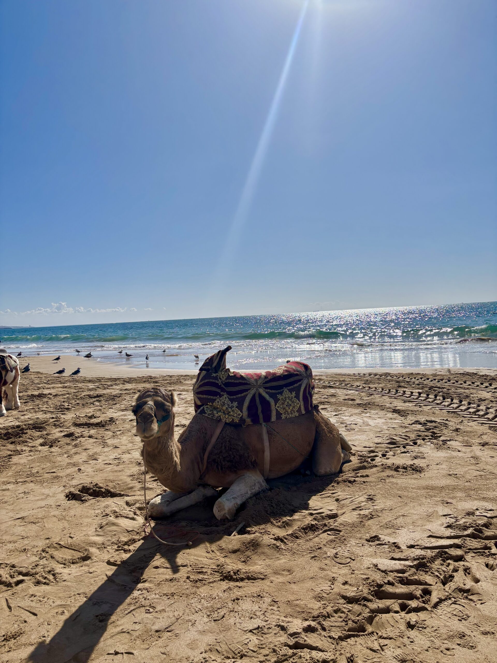 Ich konnte es nicht glauben, dass man nach nur 3,5 Stunden im Flugzeug eine so neue und kunterbunte Welt kennenlernen kann. Am nächsten Morgen stand ich direkt auf, um die Wellen zu checken. Ich war überrascht, wie viele Surfspots es gibt und wie günstig es ist, ein Surfbrett auszuleihen. Nach ein paar Stunden im Wasser aß ich eine gesunde Bowl in World of Waves, ein Lokal im Boho-Look direkt am Meer, und beobachtete das Glitzern des blauen Meeres und zwei süße Kamele, die sich sonnten. Taghazout ist für mich eine spannende Mischung zwischen einem traditionellen marokkanischen Dorf und einem europäischem Hipster-Ort. „In den 70ern haben schon die Hippis den Ort für sich entdeckt. Die kamen hier alle mit ihren VW-Bussen an“, erzählte mir ein Local auf meinem Weg in mein Surfcamp. „Ohja, diese Einflüsse spüre ich noch deutlich hier..“ dachte ich mir, als ich an der Meerpromenade herlief und mehrere Personen sah, die ihren handgemachten und originellen Schmuck gerade verkauften. Am Abend war dann die Silvesternacht und ich tanzte auf einer Party in einem der Hotels, wo ein House-DJ auflegte, in das neue Jahr 2025 ein und konnte glücklicher nicht sein. Was das neue Jahr für mich bereit hielt, konnte ich da noch nicht ahnen…
