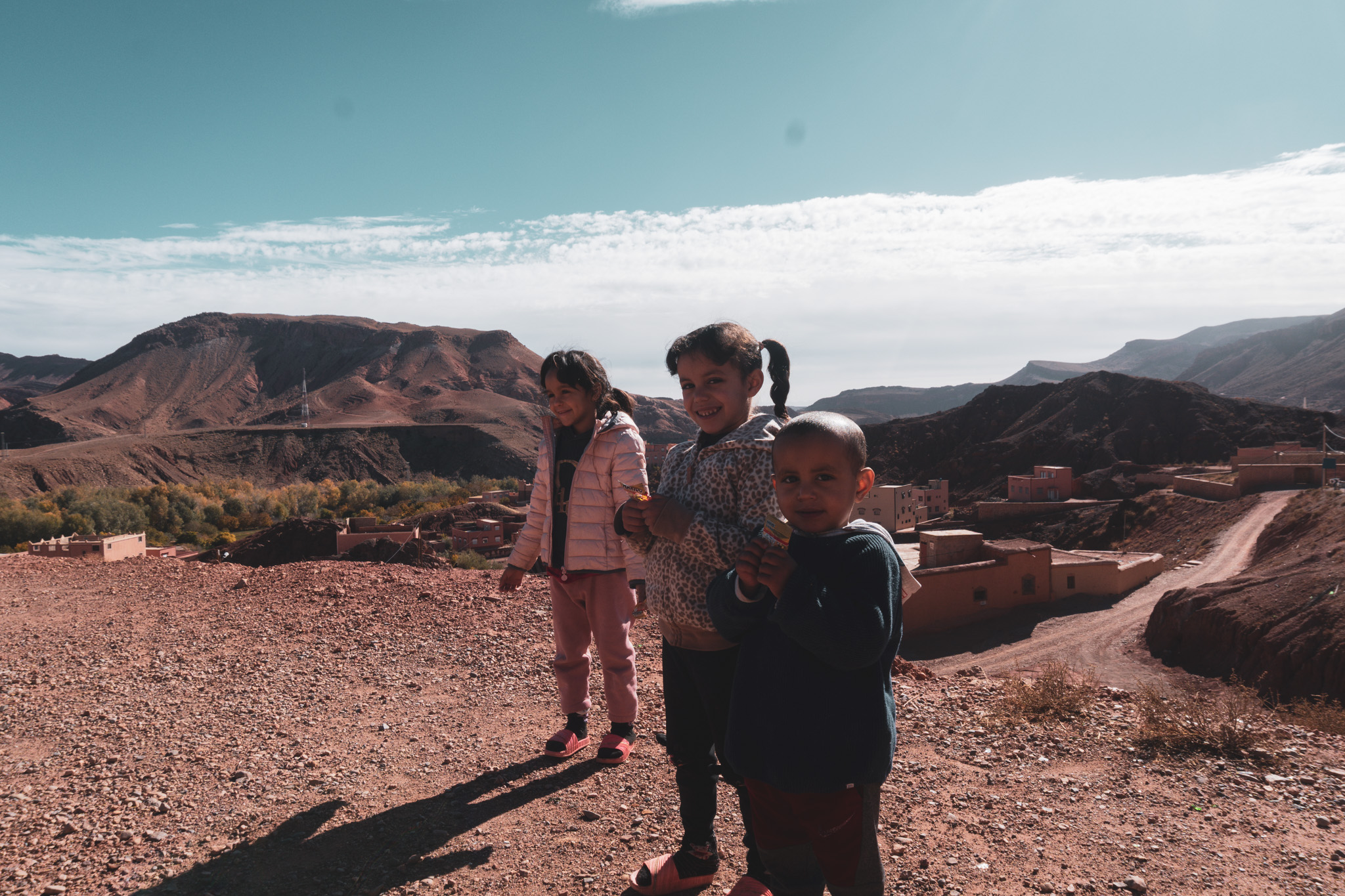 Danach fuhren wir durch diese rot-braune Landschaft weiter und machten immer wieder Foto-Stopps. Bei einem Stopp lernten wir Zakaria, Selma und Maryam kennen – drei kleine Kinder, die ganz neugierig auf uns zugelaufen kamen. Ich übte ein bisschen Darija (arabisch) mit ihnen und Silke schenkte ihnen ein paar Gummibärchen, worüber sie sich sehr freuten. Danach ging es über die berühmte Straße R704 zu einem großartigen Aussichtspunkt (Restaurant „Timzzilitte“), wo wir einen Nusnus („halb Kaffee, halb Milch“) tranken und auf die sehr kurvige Straße blickten, die Abdoul mal wieder mit links hochgefahren ist.