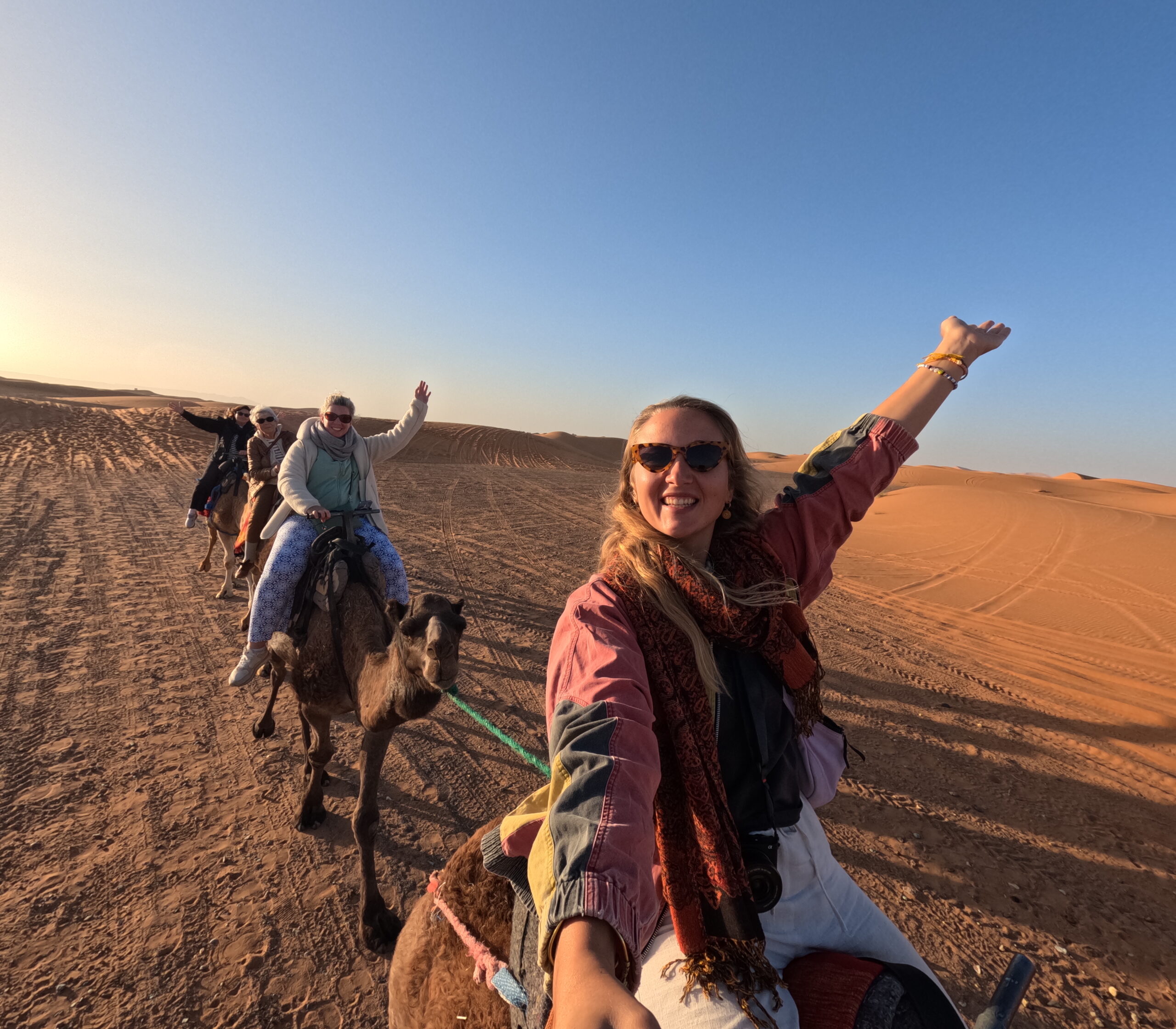 Dort angekommen wurden wir auf mehrere Dromedare gesetzt, die uns zu unserem Wüstencamp brachten. Orange-rot-braun-gelber Wüstensand überall, Hügel für Hügel, endlose Weite und wir sieben auf sieben Dromedaren mit Mohammed, unserem Karawanen-Führer. Momente, die wir nie vergessen werden. Momente, die sich wie in 1001 Nacht anfühlten. Je weiter wir in die Wüste hineingingen, umso magischer wurde es. Nach einer Weile stiegen wir ab, um den Sonnenuntergang zu genießen. Ich musste mich wirklich kneifen, um das realisieren zu können. Ich bin in der Sahara, der größten Sandwüste der Welt… es war unglaublich. Paul und Elisabeth, die beide schon über 80 Jahre alt sind und Geschwister sind, waren auch überglücklich und meisterten den Kamelritt super. Wenn ich eines Tages so alt bin, möchte ich genau so sein wie die beiden, und auch noch so viel reisen – eine wahre Inspiration!